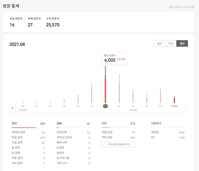 열심히 쓰면 조회수가 늘어서 재미는 있다. 그런데 포스팅을 멈추면 바로 반응이 온다고 할까?